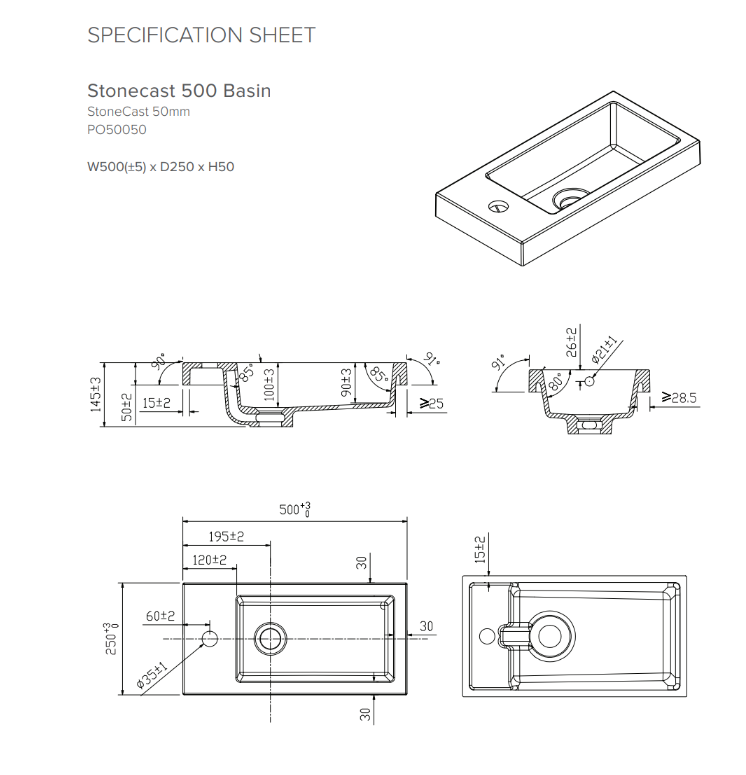 - 500 Stonecast Basin 80mm (Please see third image). Tapware and basin accessories are not included.