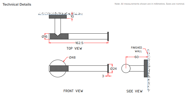 Please view technical line drawings below for any specific measurements. We will not be liable for mismeasurement of space meaning the Toilet Roll Holder you order does not fit right. Make sure the Toilet Roll Holder suits the space before ordering as we will not refund.